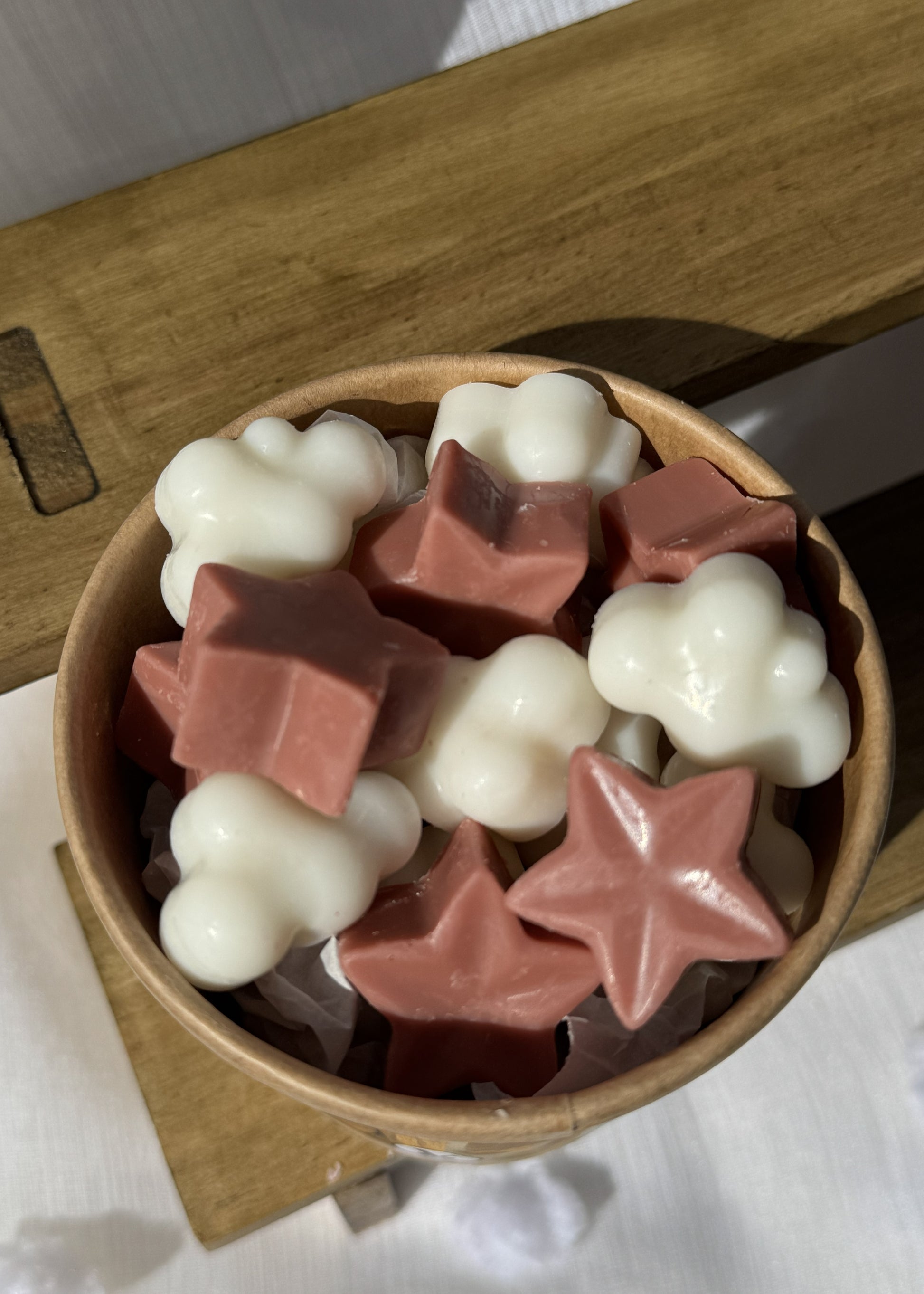 - 🤎 En el aroma de Palo Santo: La forma de los wax melts son estrellas marrones o blancas y nubes blancas.